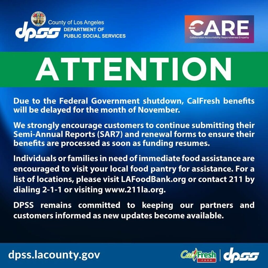 與此同時,洛杉磯縣11月份的CalFresh糧食券發放預計將出現延遲。如有緊急食物需求,請訪問www.lafoodbank.org,或撥打 211,亦可登入 www.211la.org 查詢附近的食物援助資源。