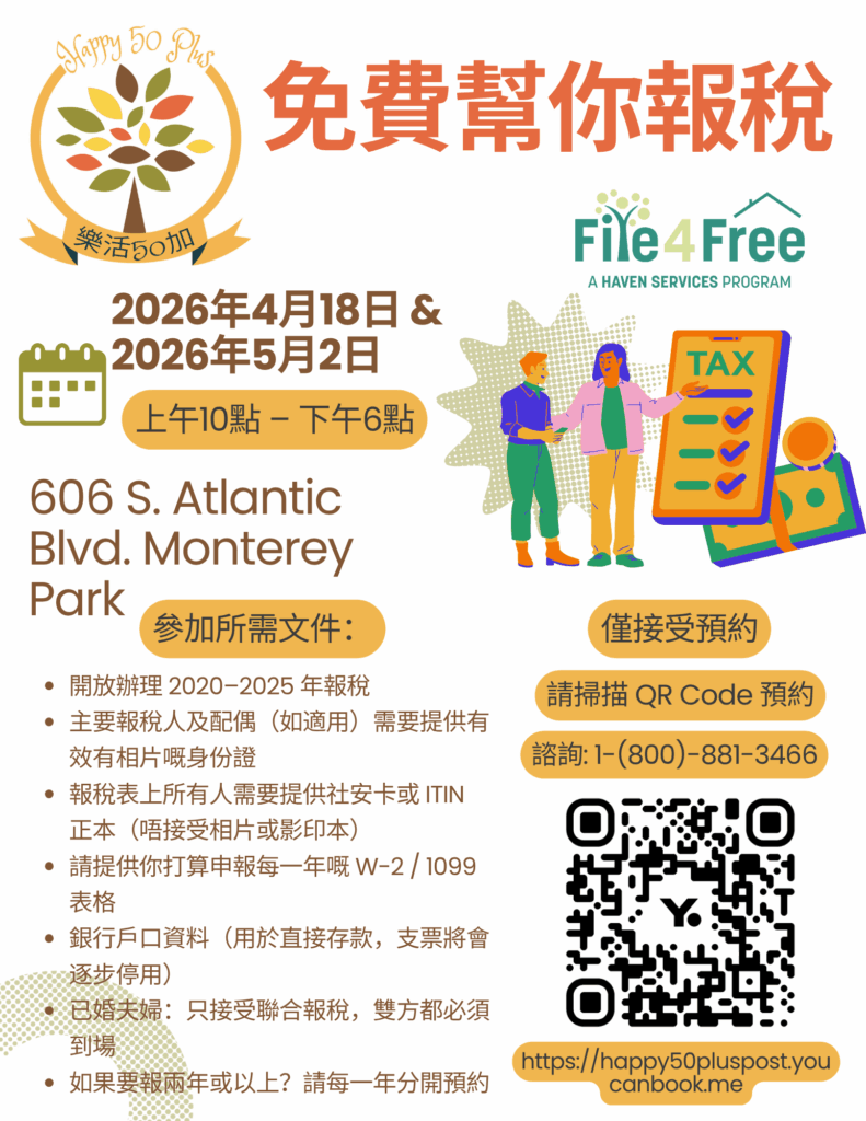 為協助社區中老年朋友順利完成報稅,樂活50加將於 2026 年3月14日、4月3日舉辦兩場免費報稅活動,為符合條件的民眾提供協助。美國國稅局(IRS)所得稅義工援助(VITA) 和老年人稅務諮詢(TCE) 計畫,將免費協助符合條件的個人填寫基本報稅表。