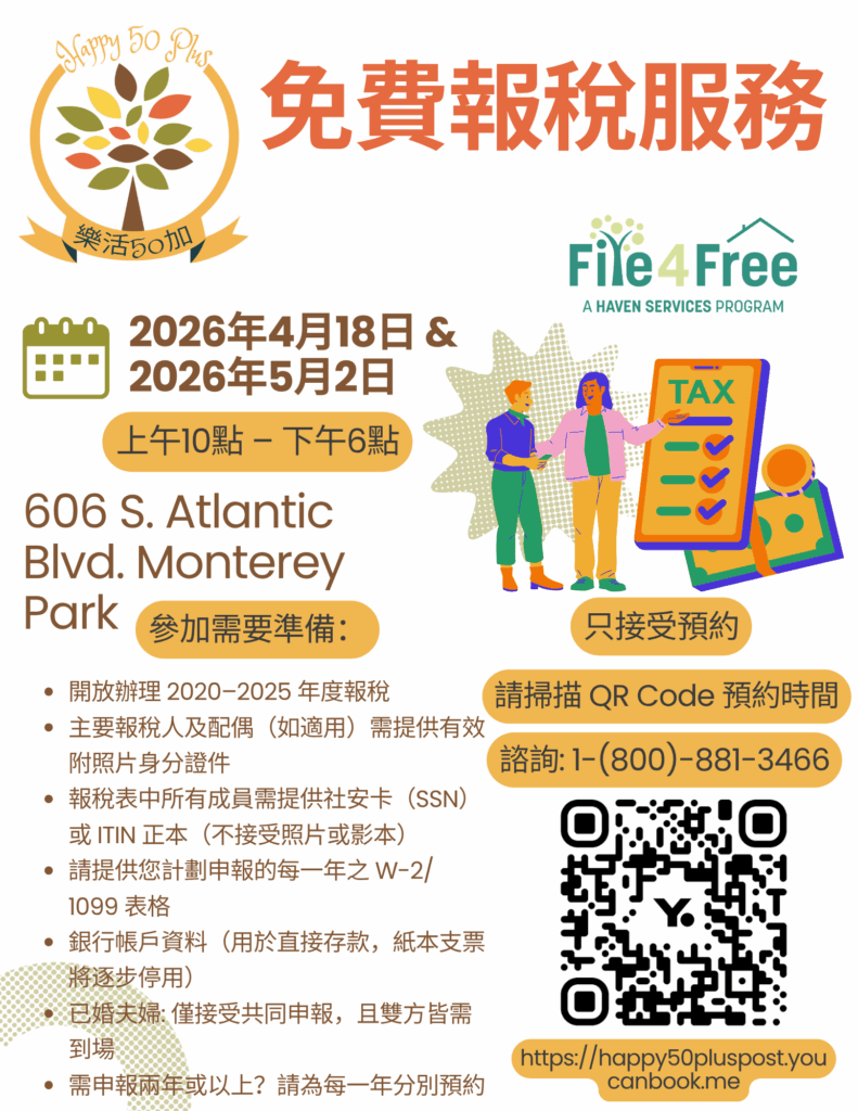 此次活動由樂活50加聯合公益機構Haven Services旗下稅務平台File4Free共同舉辦,專門為社區居民提供免費報稅協助。所有參與的報稅義工都經過IRS嚴格培訓和認證,熟悉中老年人及中低收入家庭的報稅情況。